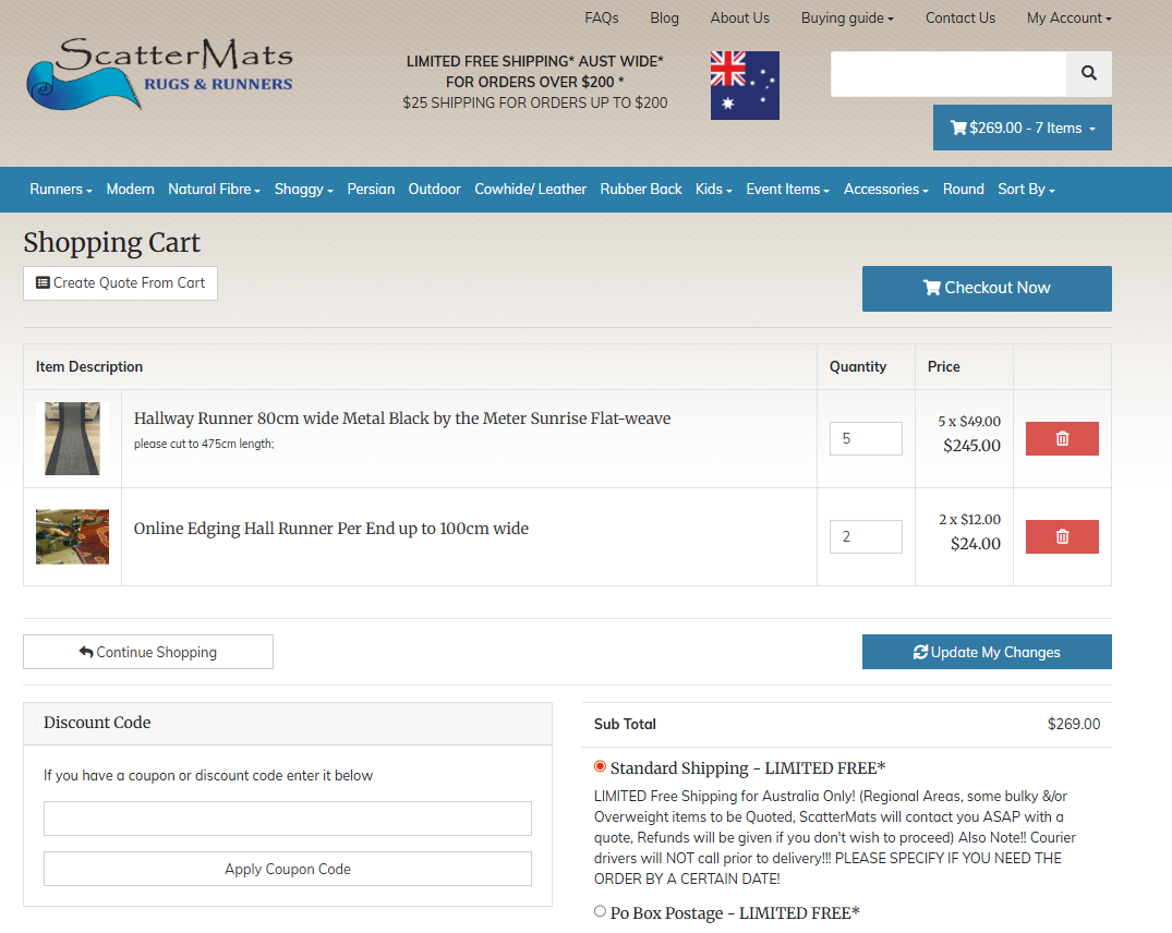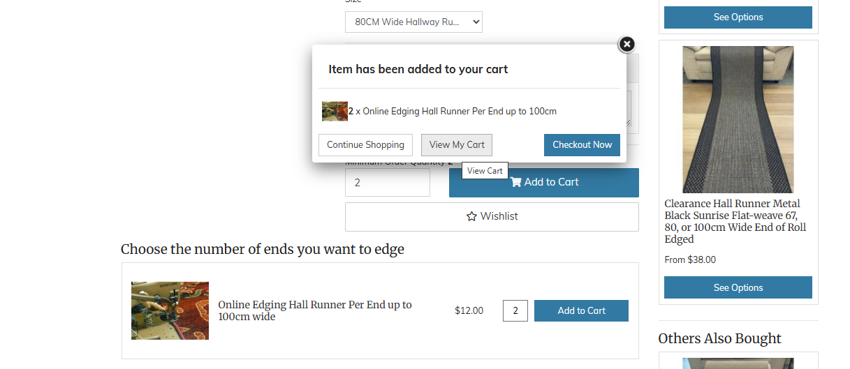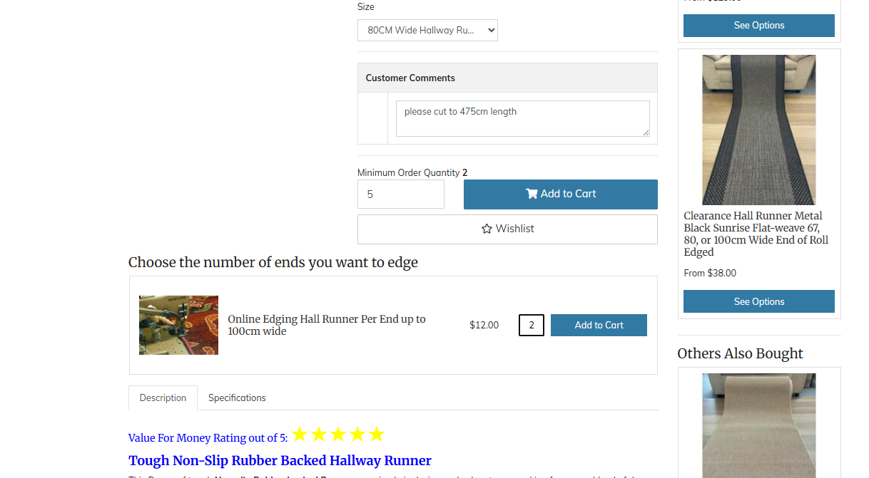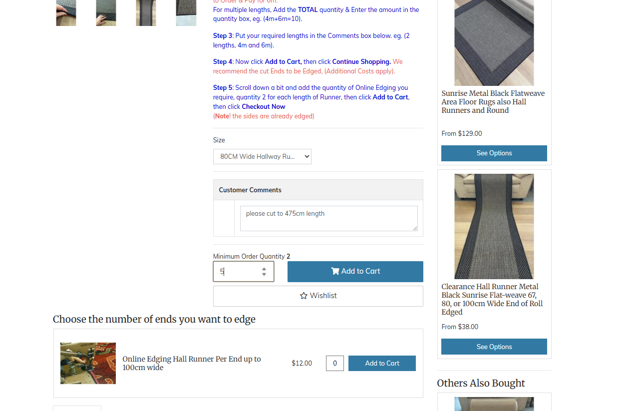 Enter a Qty of 2 per length of runner, so we will edge both ends of the Runner for you. Then "Add to Cart".